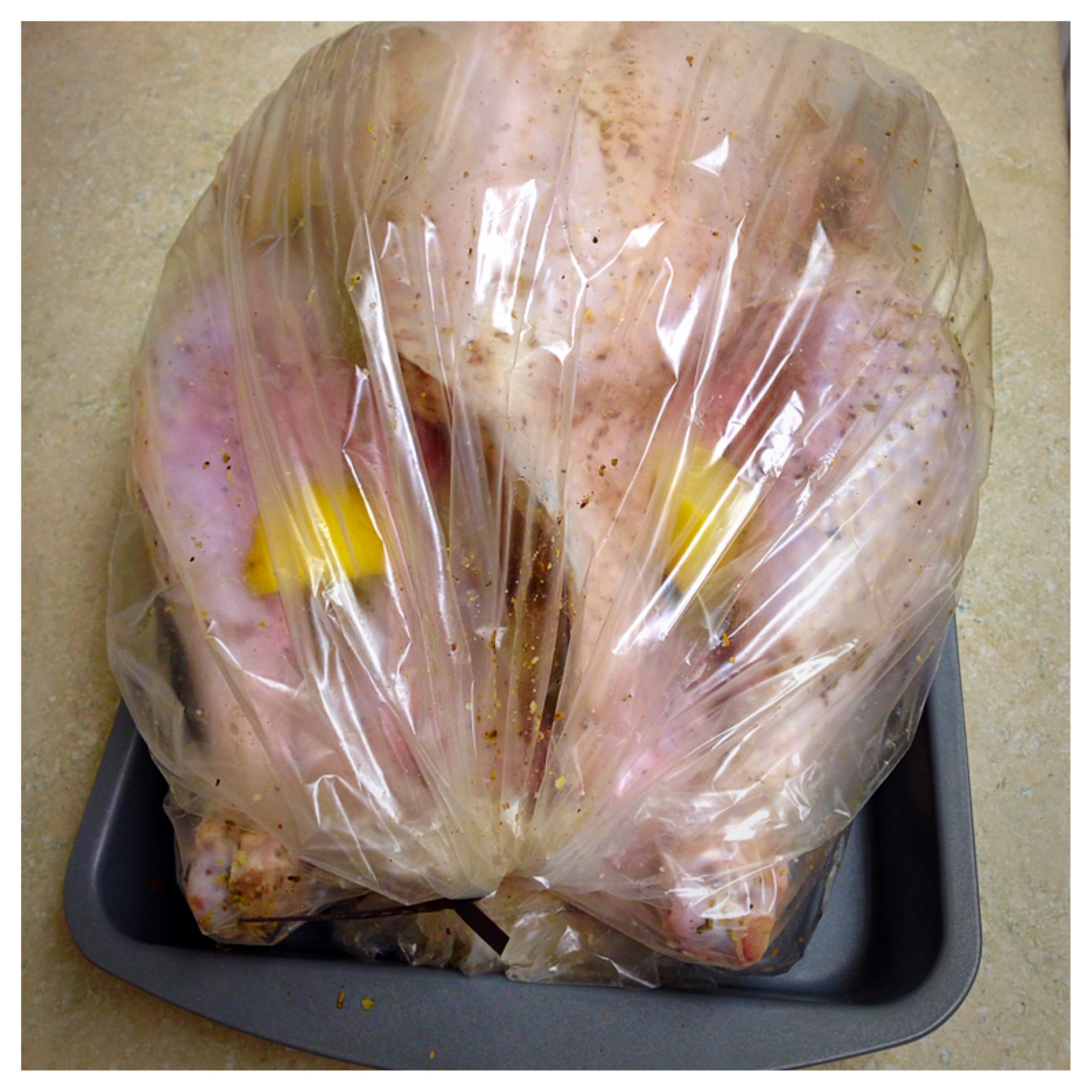 •Put the Turkey in the bag and add the remainder lemon chunks, onion chunks, and garlic cloves around the turkey.