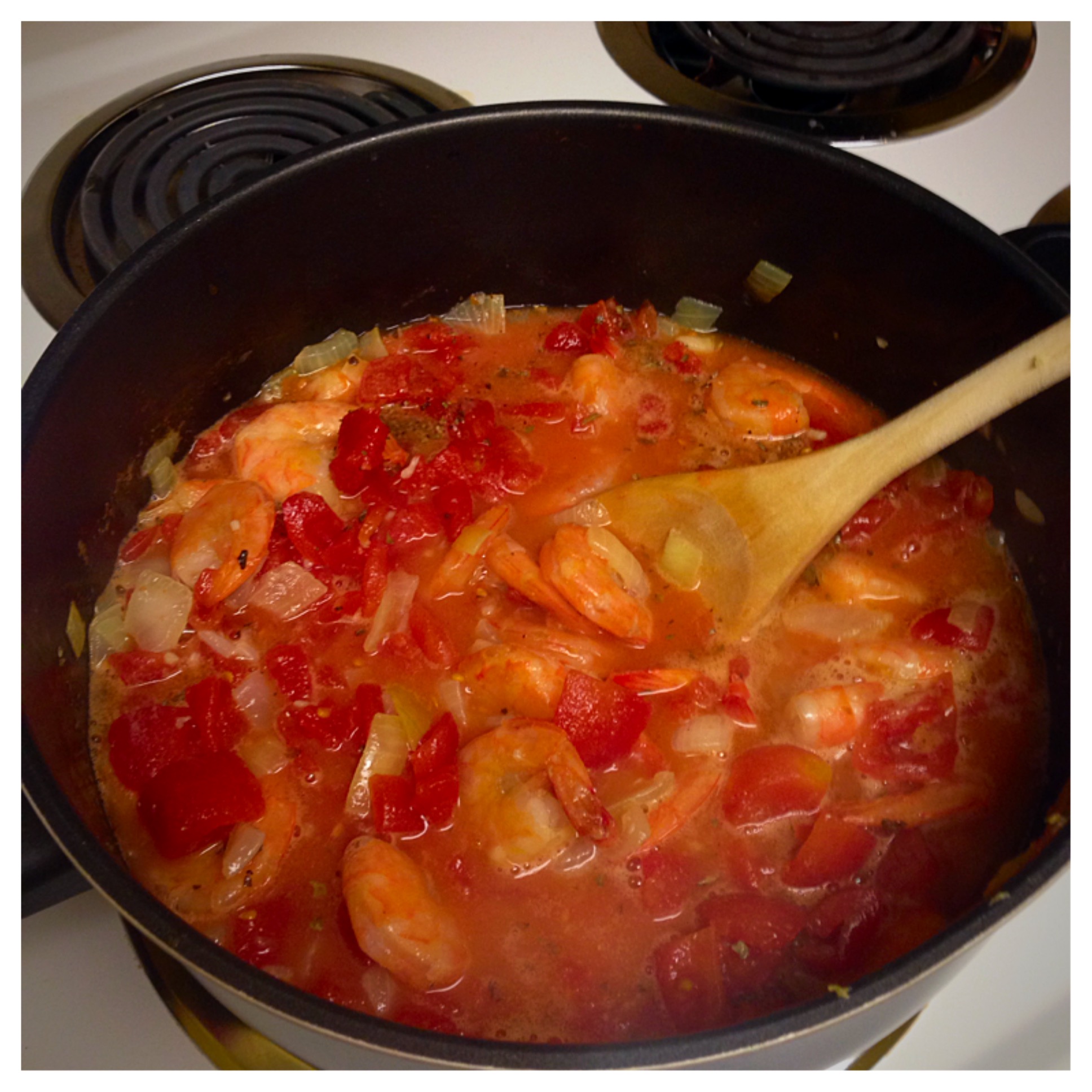 - Once your shrimp is cooked you can go ahead and add the two cans of diced tomatoes
