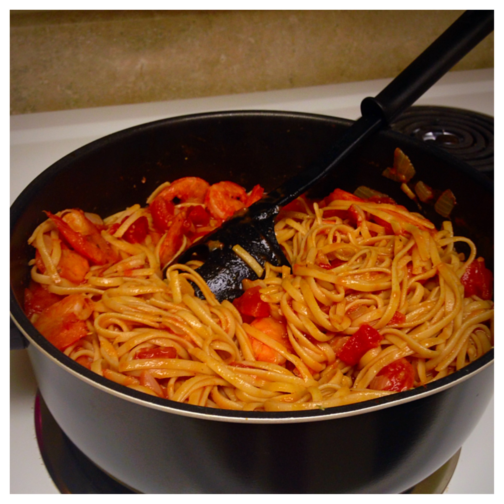 - Once the water is at a boil, add in your linguini (Make sure to strain the linguini when it’s cooked!)
