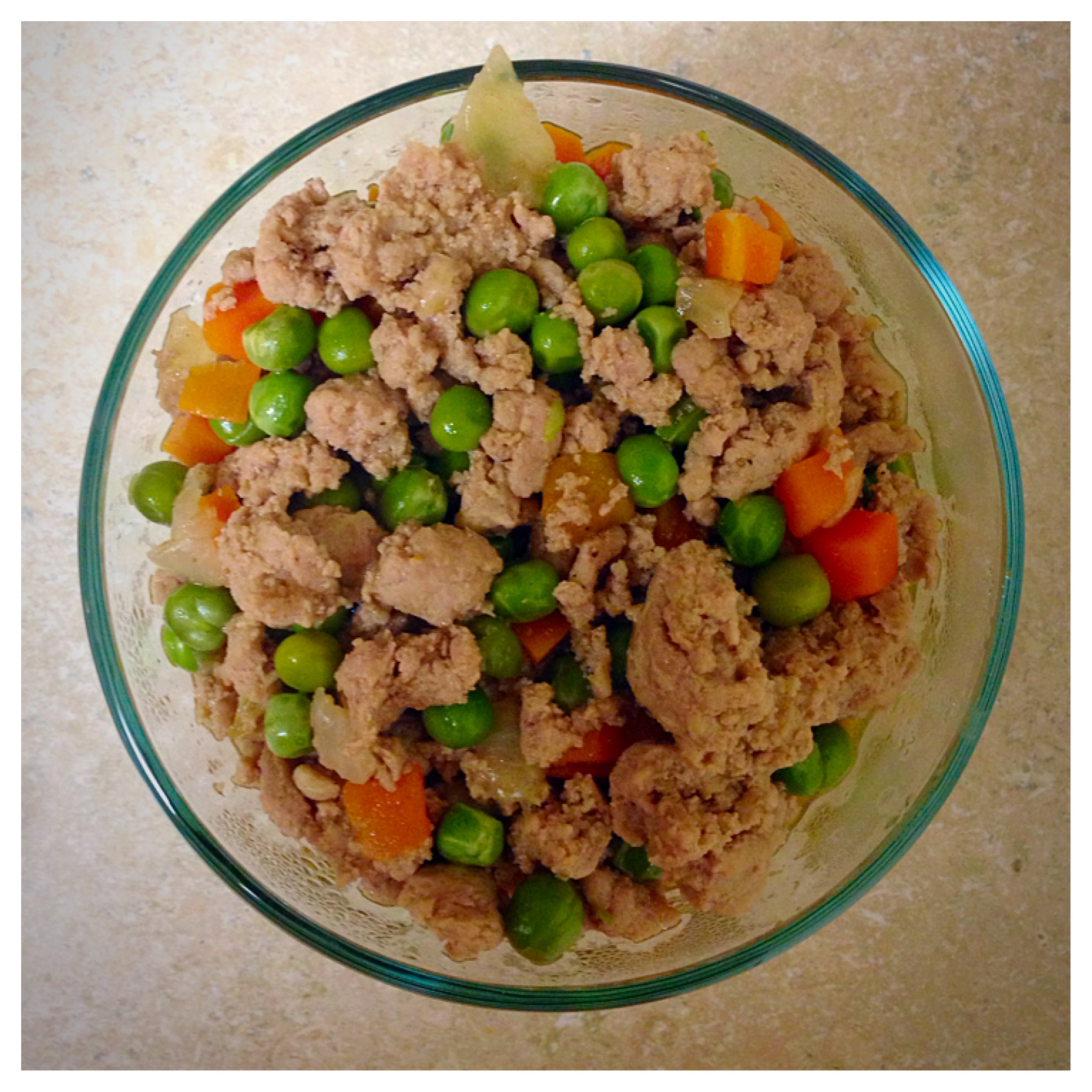 - Add the bag o frozen peas and carrots to your ground turkey mixture, cover, turn the heat down, and let simmer.