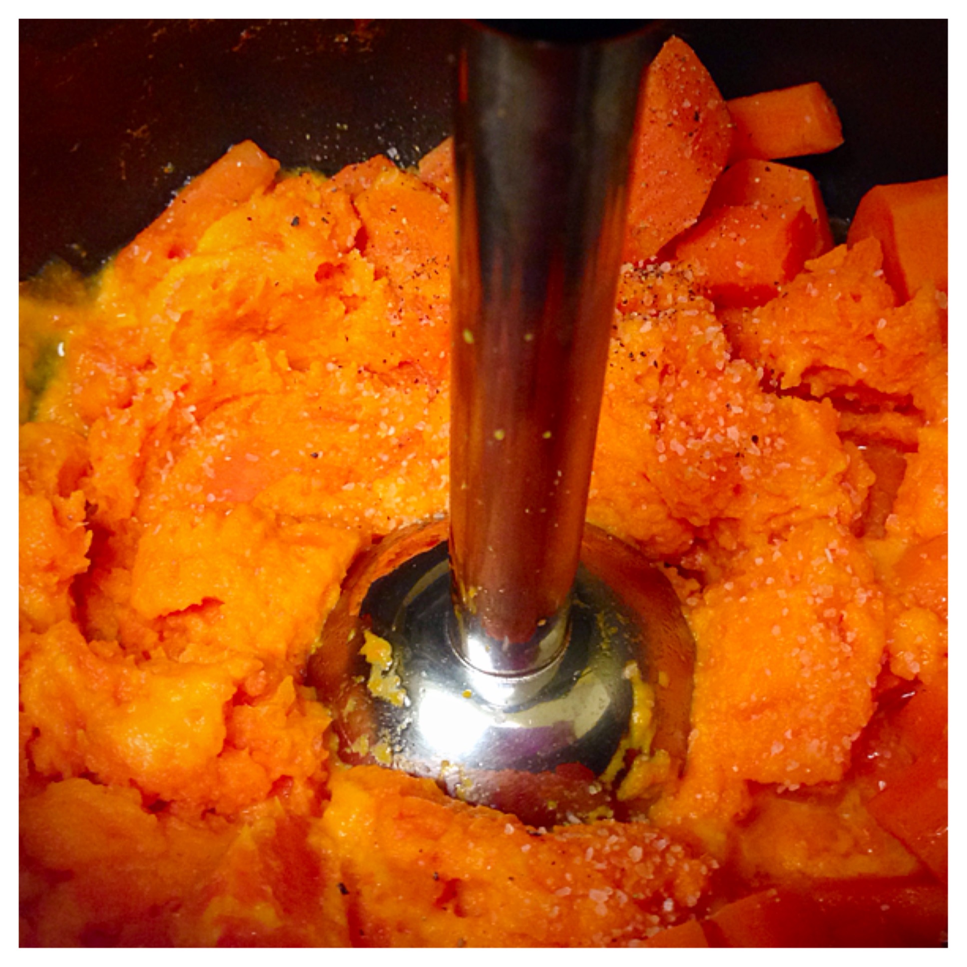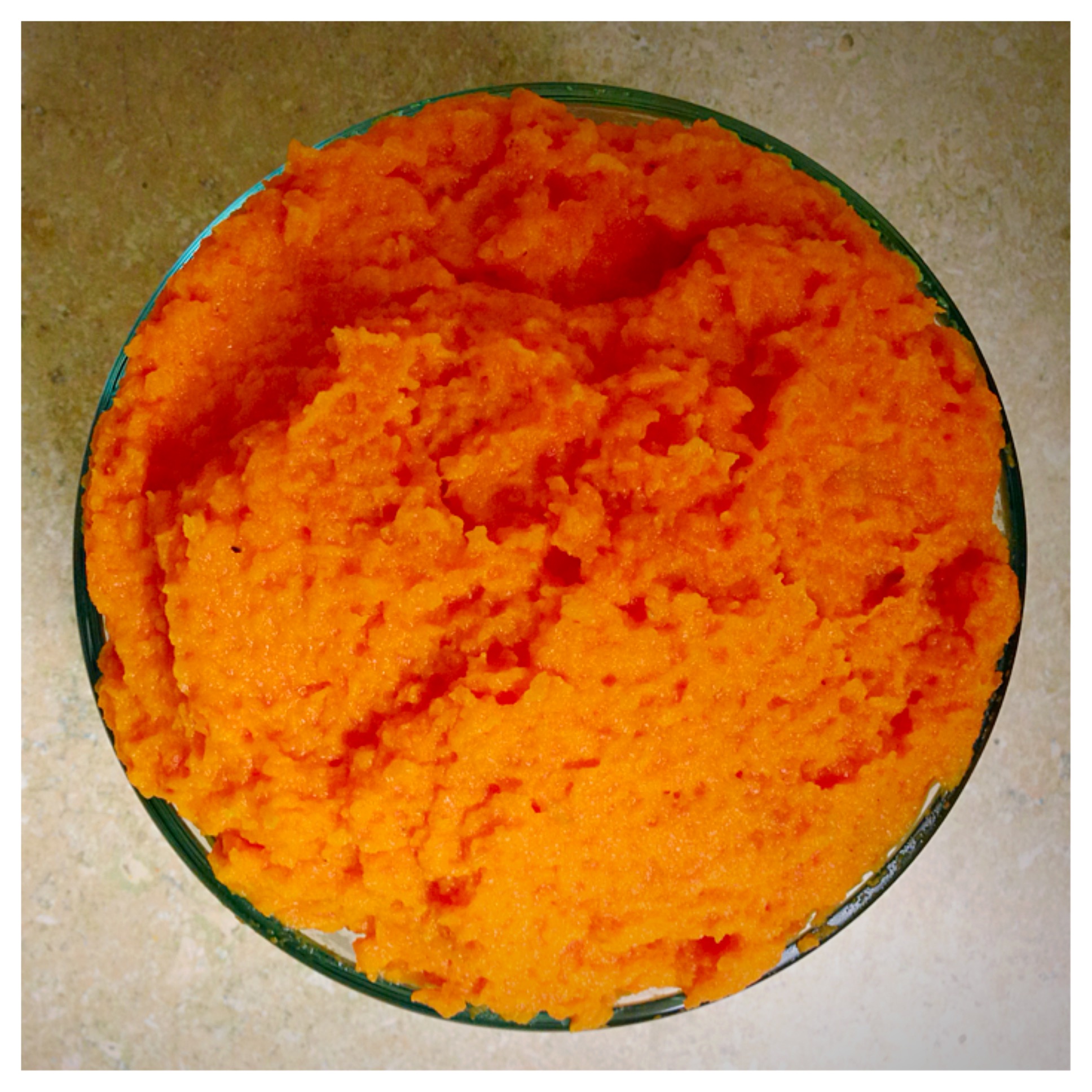 - While your turkey mixture is simmering, drain your carrots and put them in the food processor along with a healthy knob of butter and salt.