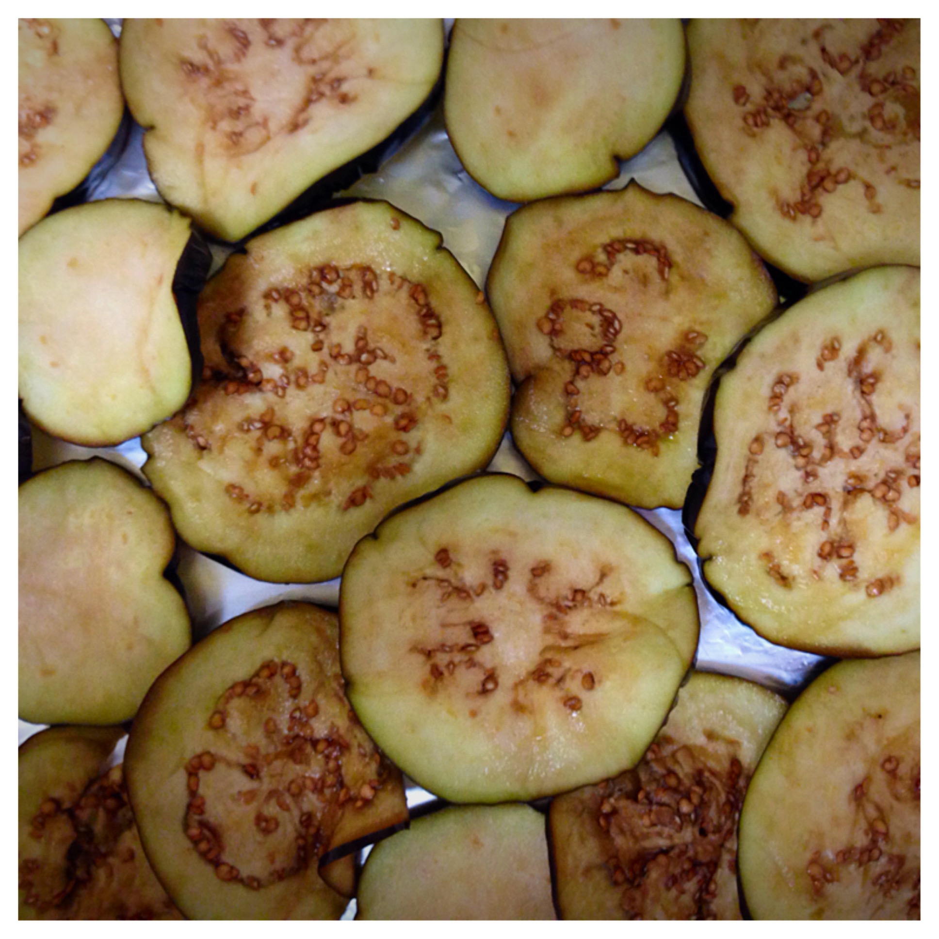 - When your eggplant is ready, pat each slice dry with a paper towel and place one by one on a baking sheet. *Do not put the slices on top of each other*