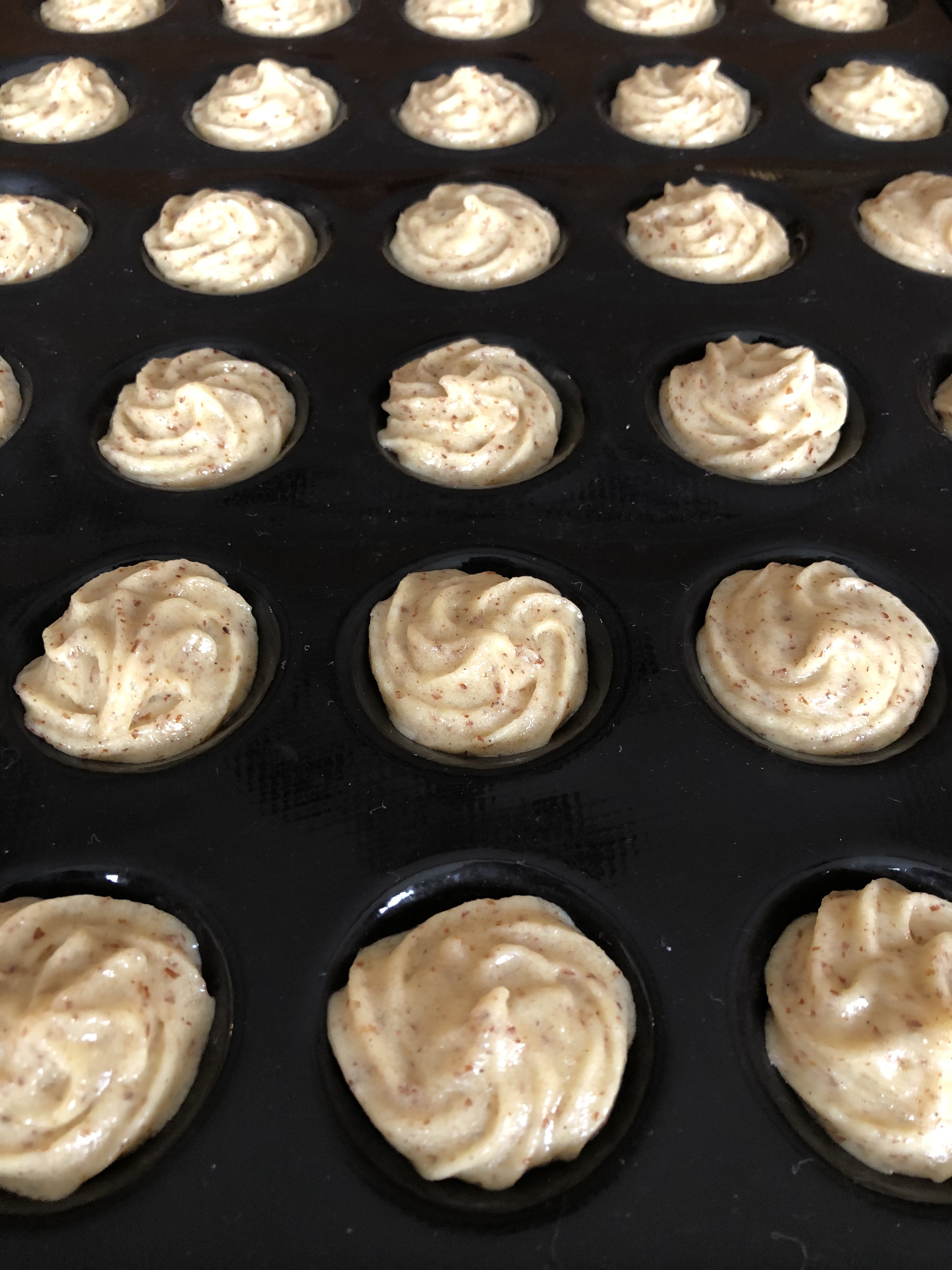 - I added the batter to a piping bag in order to make it easier for me to place them in the moulds. You do you, but I would highly suggest this.