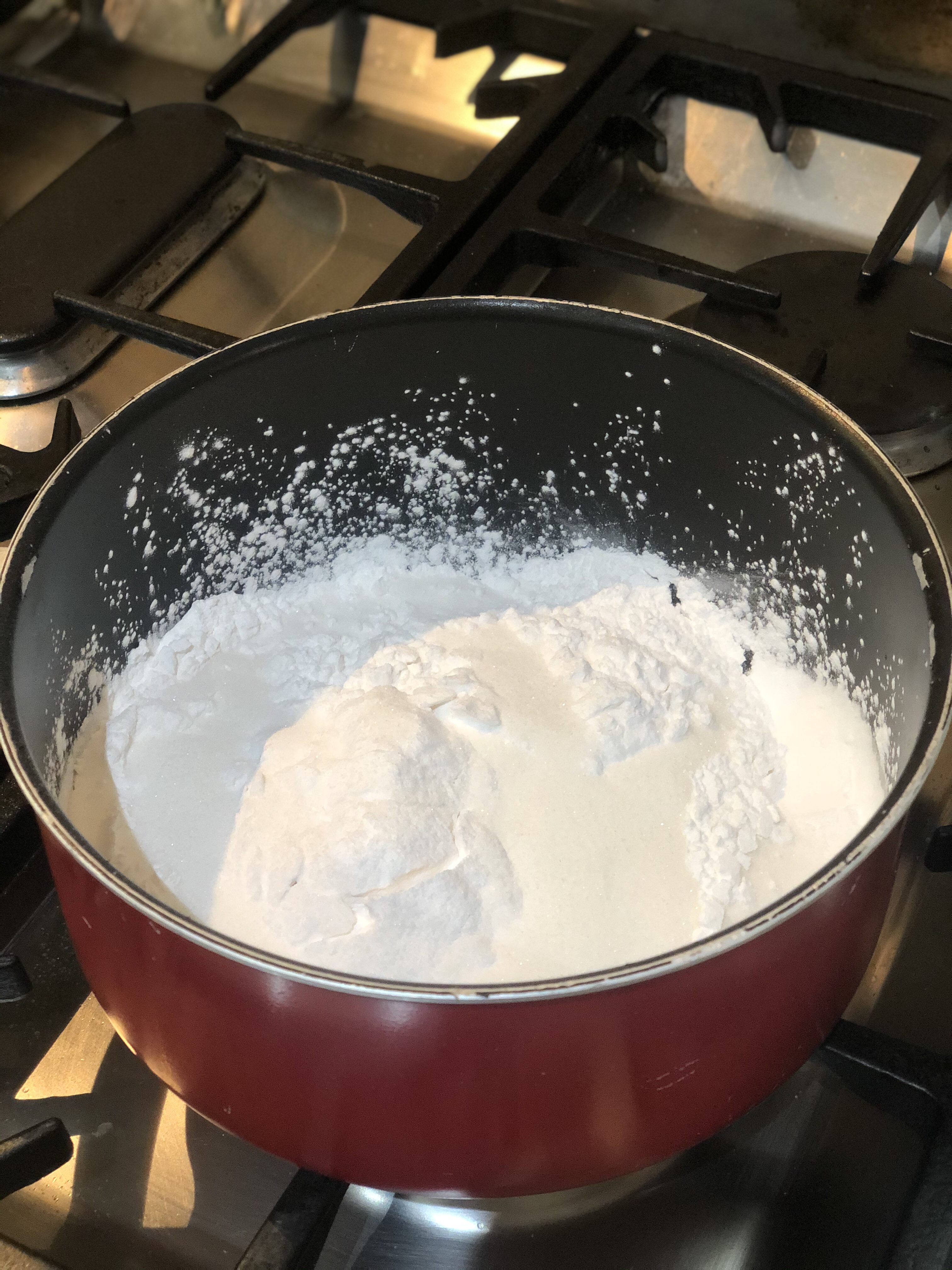 - In a big pot, whisk together the arrowroot, sugar over medium heat while slowly incorporating the milk. Make sure you whisk like your life depended on it so that there are no lumps.