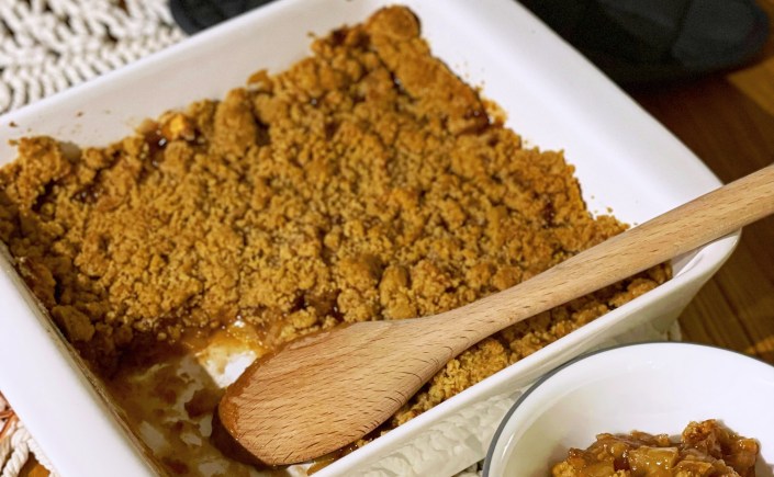 - In a baking dish, place the apple mixture at the bottom, then add the topping on top.
