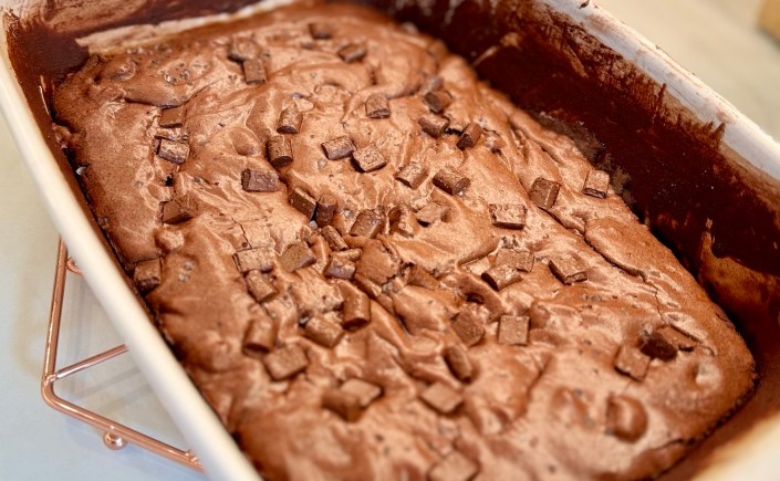 - Pour your batter into your lined baking pan and top with the rest of your chocolate chunks